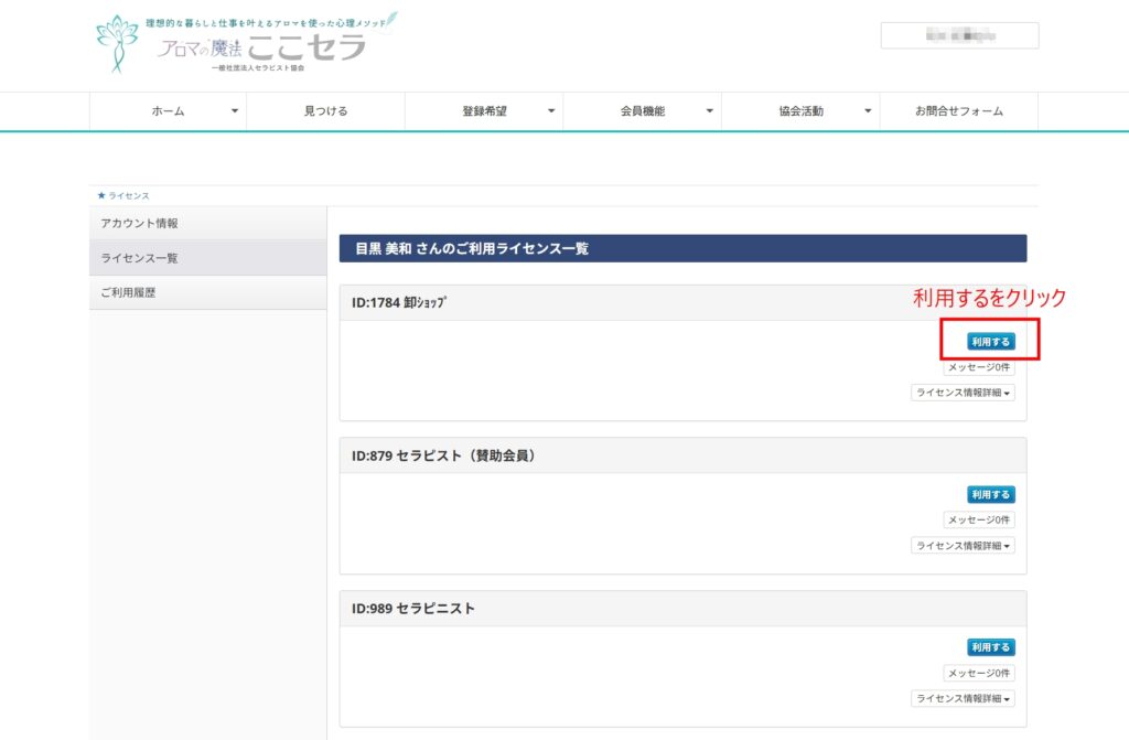 ご自身の持つ資格(ライセンス)の一覧が表示されるので、【卸ショップ】の【利用する】をクリック