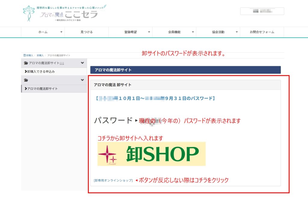 アロマの魔法 卸サイトへ入れるパスワードとサイトへ入れるボタン表示が現れます。